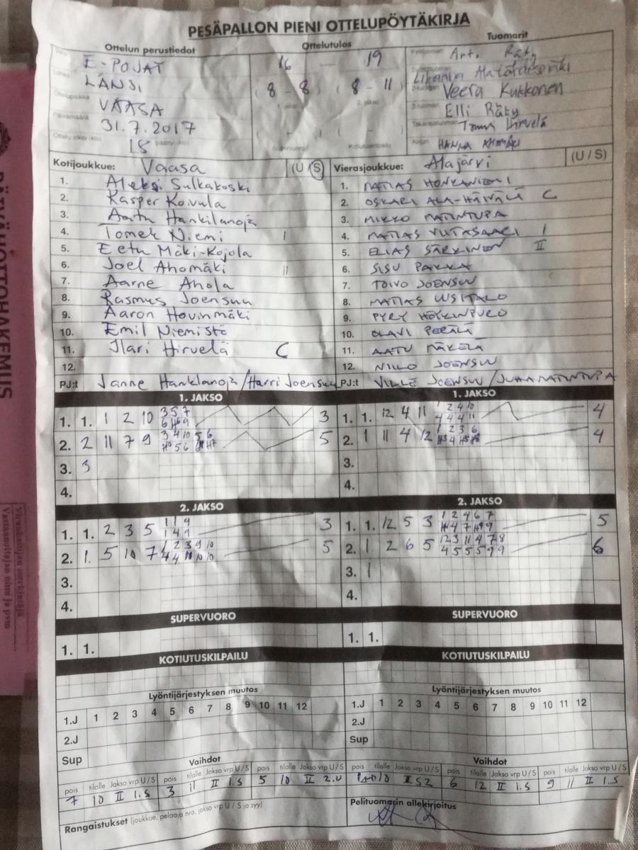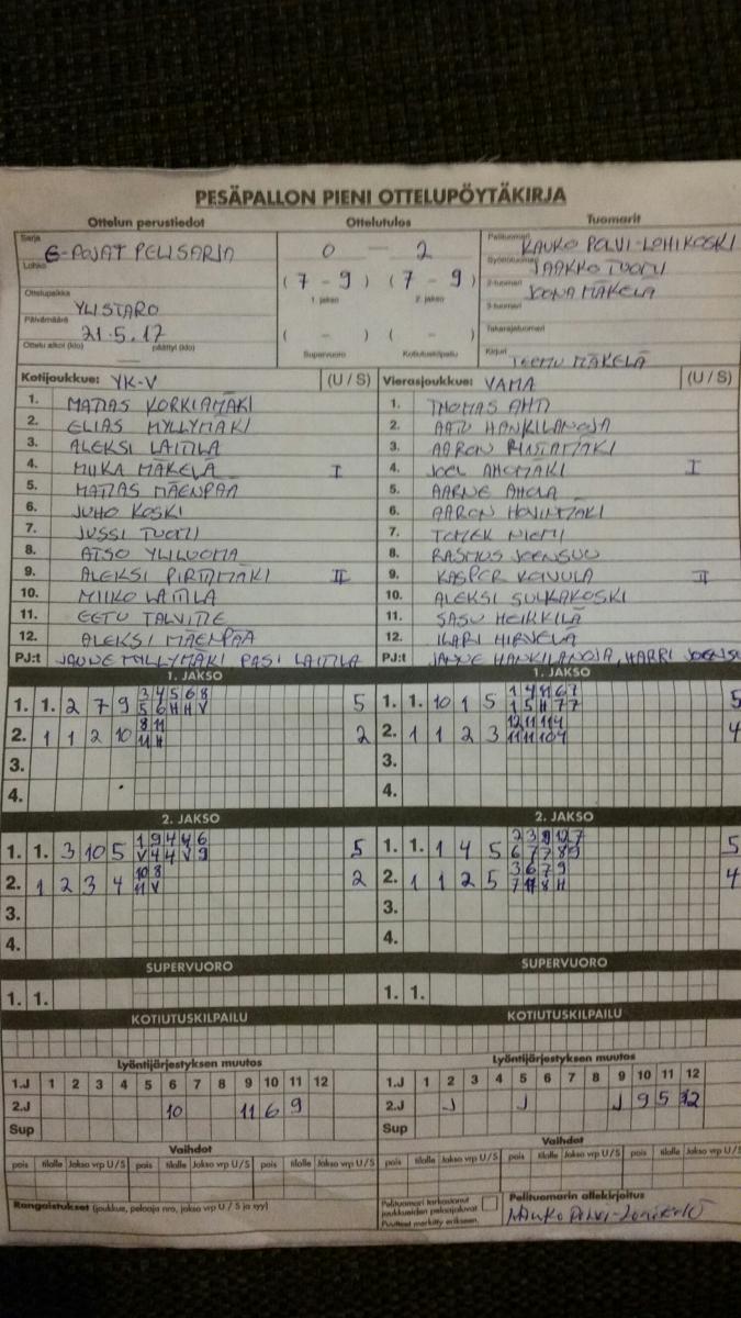 | 20.8.2017 18:00 | YPJ | VM | 2-1 (11-2, 5-7, 2-0) | näytä |