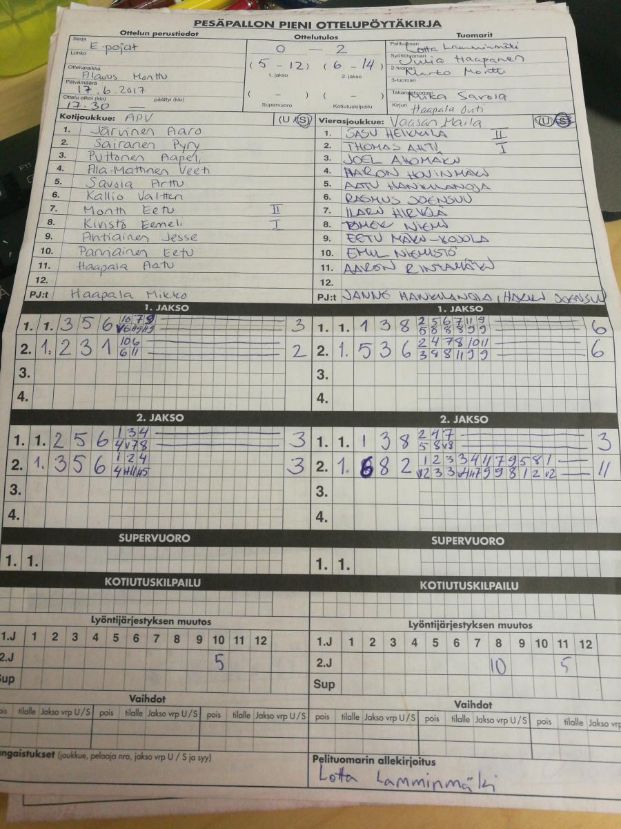 | 20.5.2017 18:00 | VäVi | VM | 0-2 (9-18, 2-10) | näytä | |