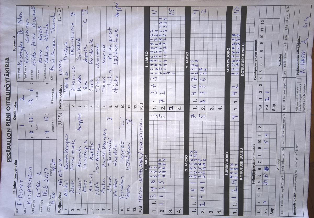 | 20.5.2017 18:00 | AA | SMJ07 punainen | 2-0 (11-9, 12-6) | näytä | |