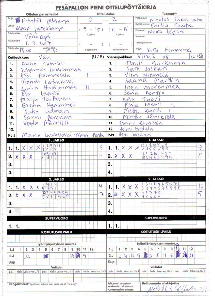 | 17.7.2017 18:00 | VäVi | Virkiä08 | 0-2 (9-15, 11-15) | näytä | |