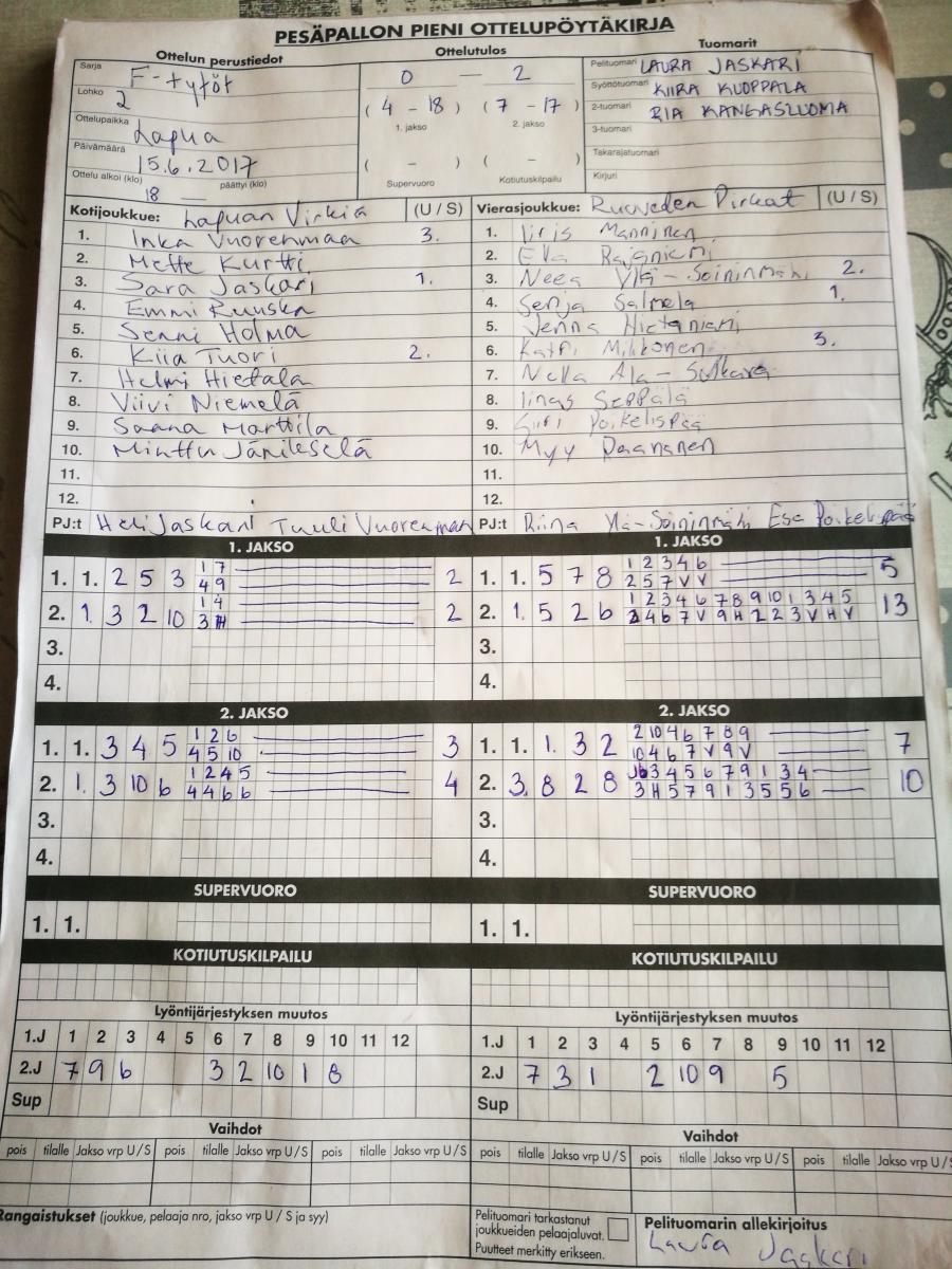 | 17.7.2017 18:00 | RuoPi | KaKa | 2-0 (7-0, 17-5) | näytä | |