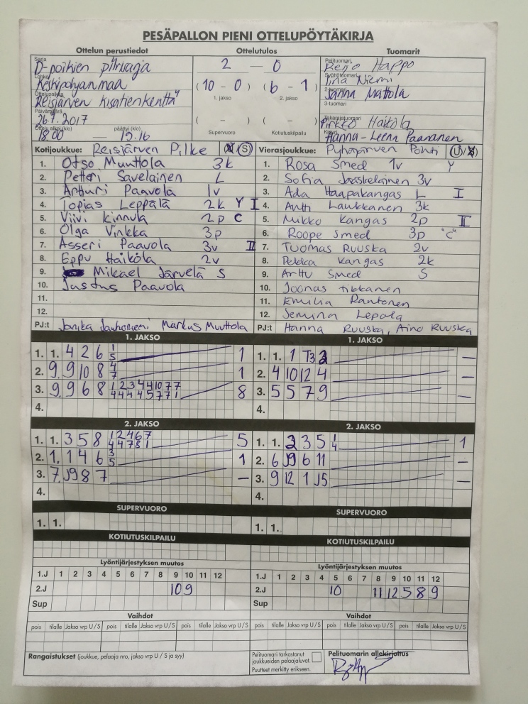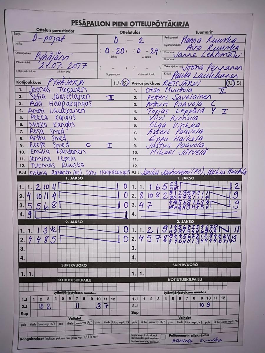 | 26.7.2017 | Pyhäjärvi | Reisjärvi | 0-2 (0-20, 0-24) | näytä | |