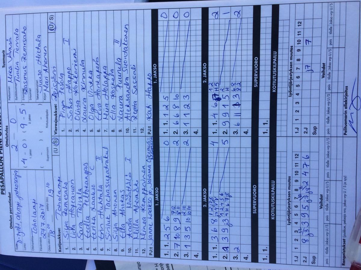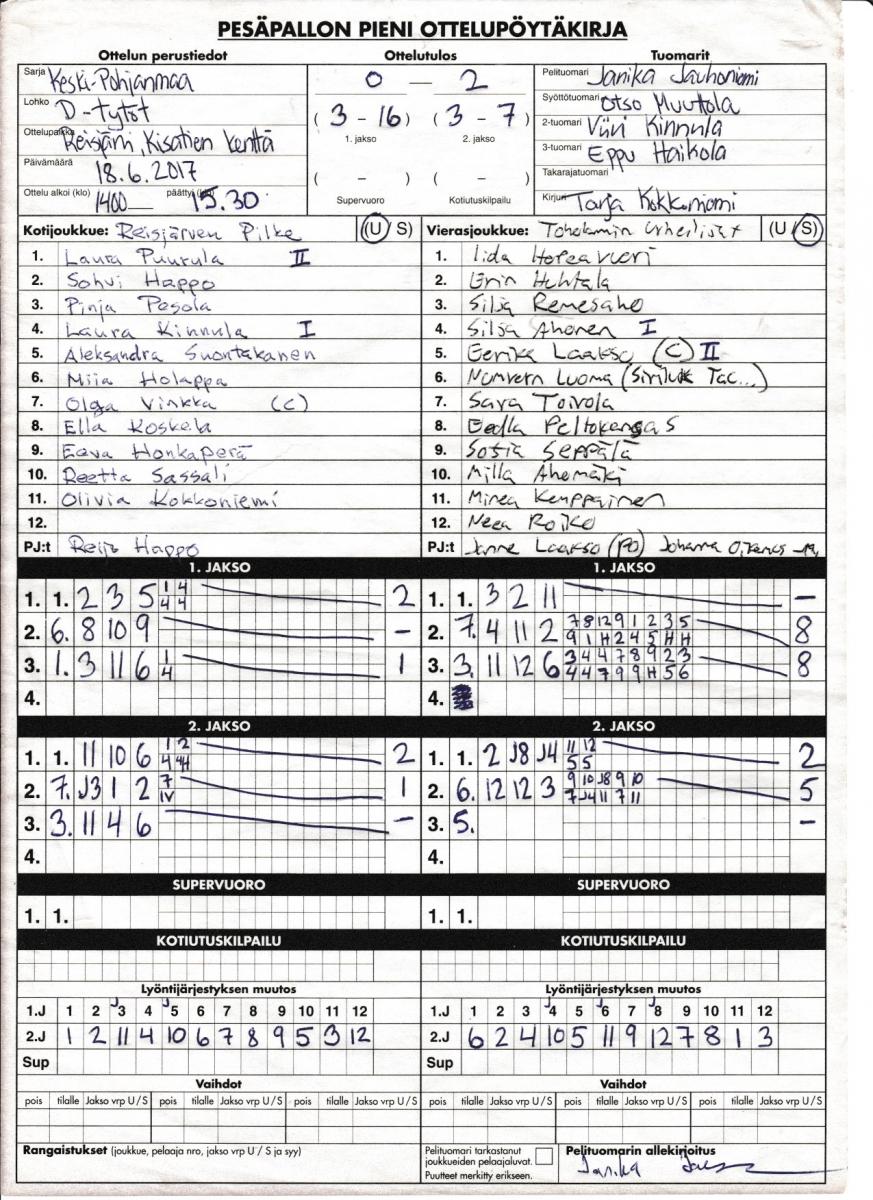 | 18.6.2017 | Reisjärvi | Toholampi | 0-2 (3-16, 3-7) | näytä | |