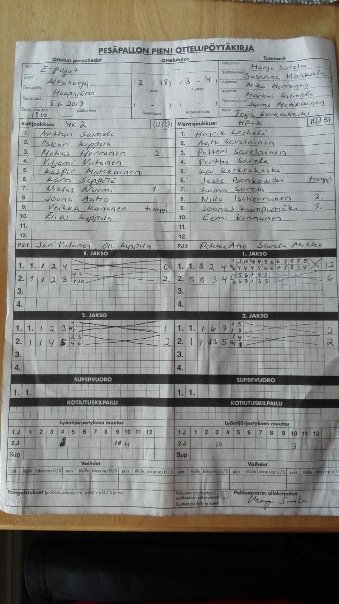 | 15.6.2017 | Haapajärvi | Veteli | 2-0 (14-1, 5-4) | näytä | |