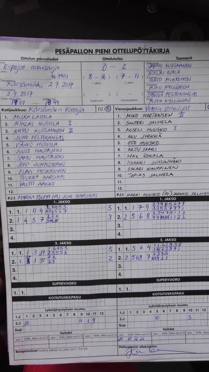 | 4.7.2017 | Toholampi | Kärsämäki | 0-2 (7-13, 4-26) | näytä |