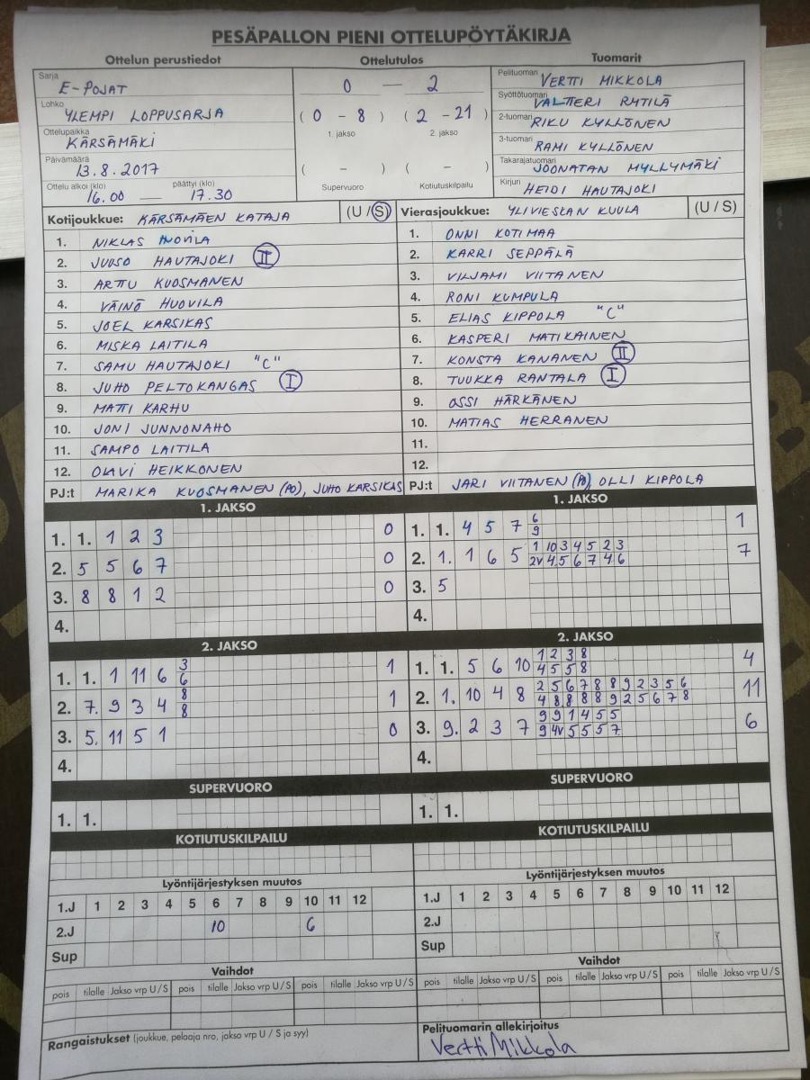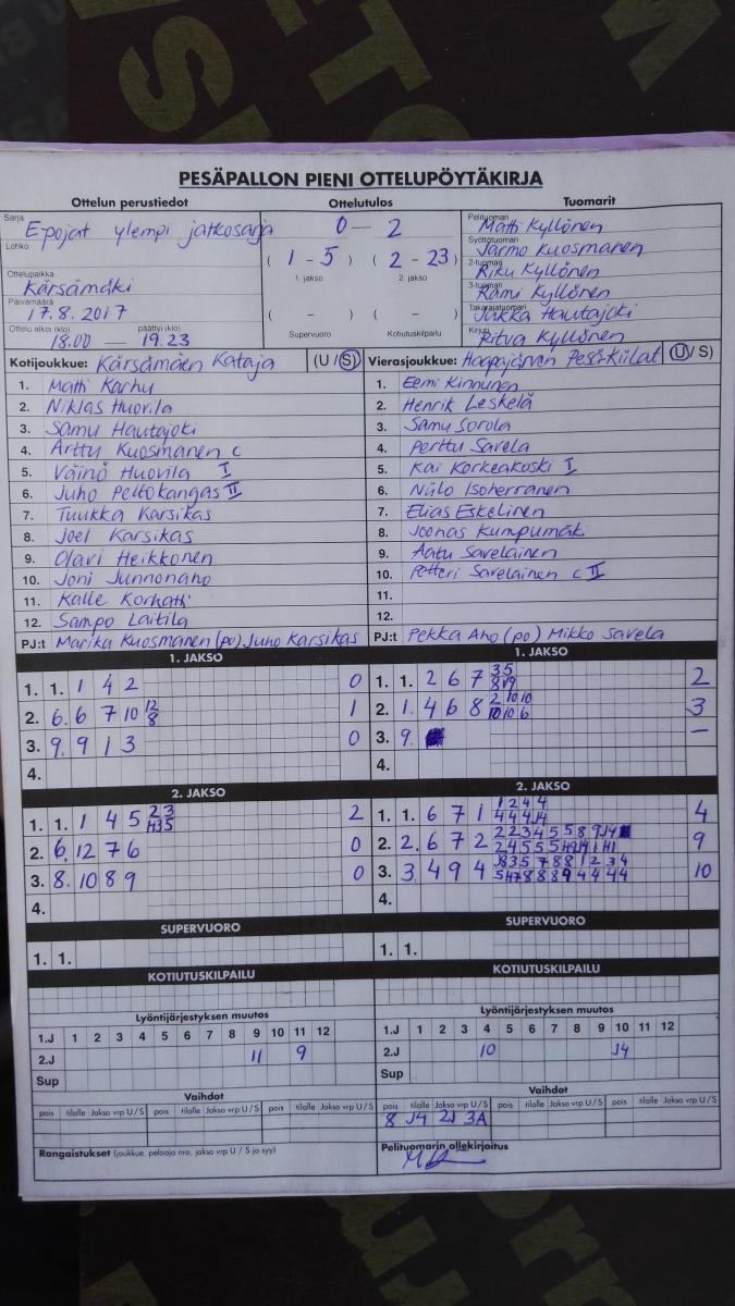 | 17.8.2017 | Kärsämäki | Haapajärvi | 0-2 (1-5, 2-23) | näytä |