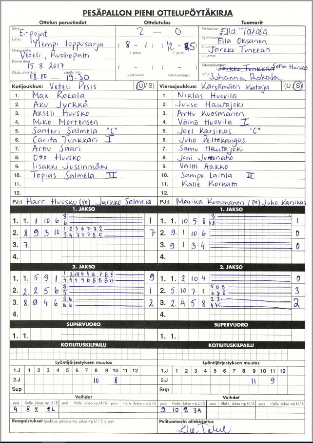 | 20.8.2017 | Veteli | Kärsämäki | 2-0 (15-4, 5-3) | näytä |
