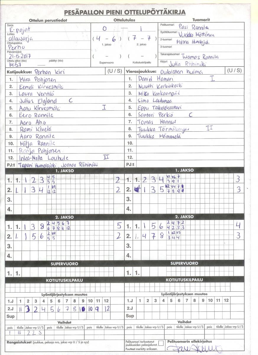 | 21.6.2017 | Oulainen | Haapajärvi | 0-2 (2-18, 2-16) | näytä | |