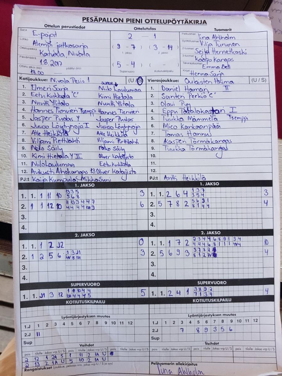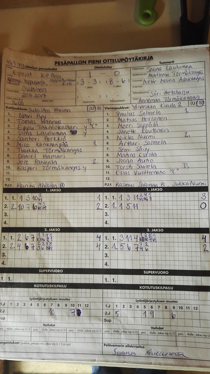 | 9.8.2017 | Oulainen | Kinnula | 2-0 (4-1, 10-7) | näytä | |