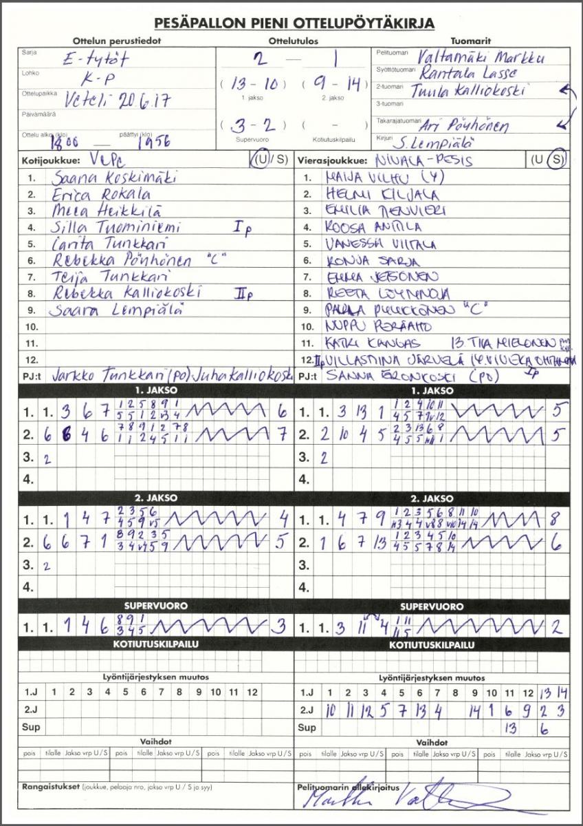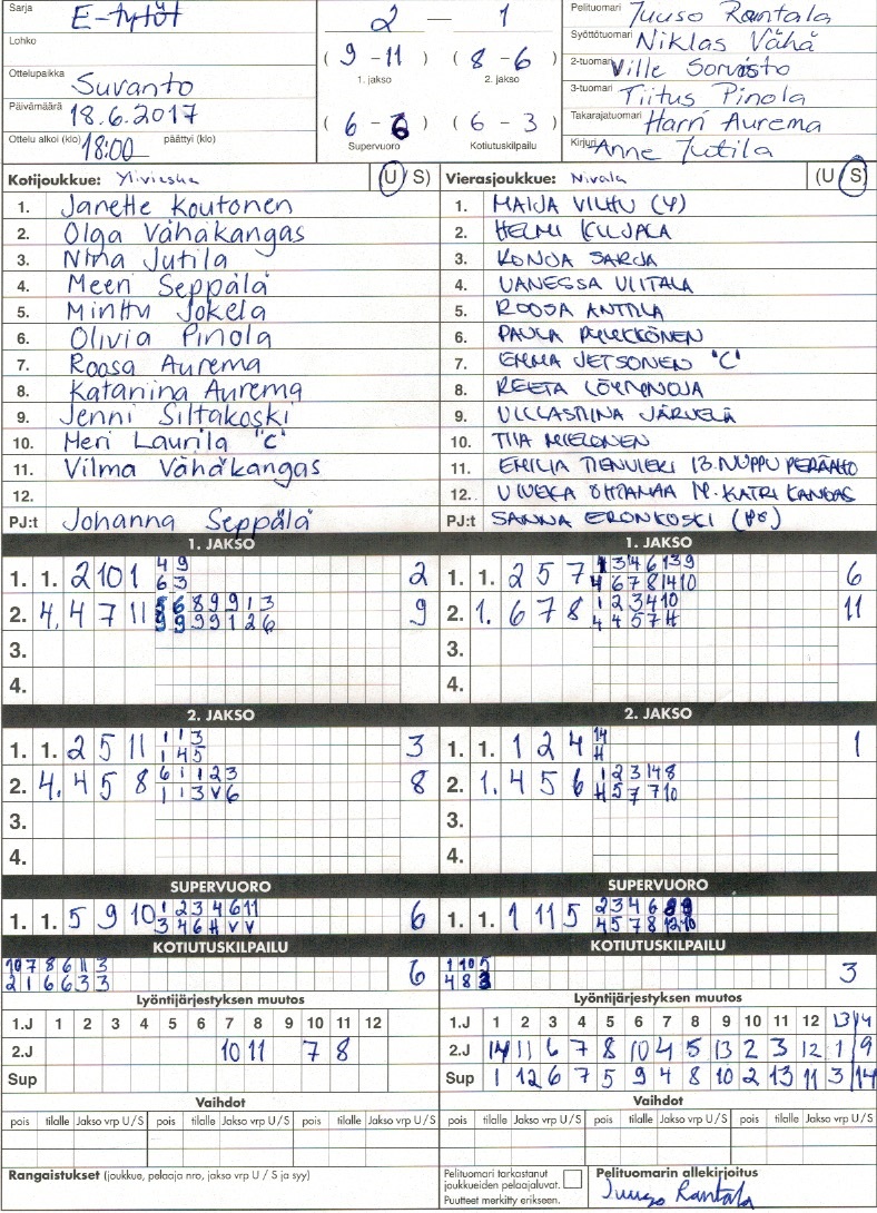 | 20.6.2017 | Veteli | Nivala | 2-1 (13-10, 9-14, 3-2) | näytä | |