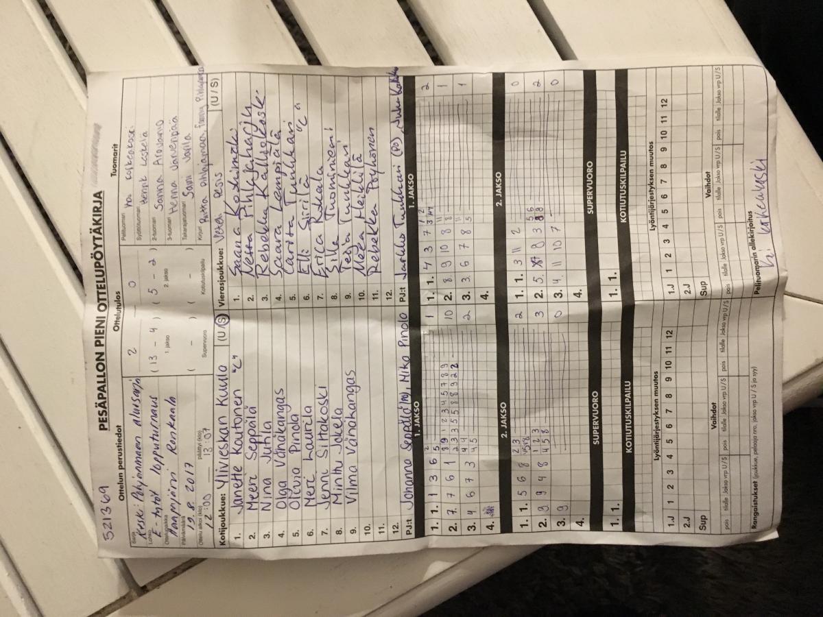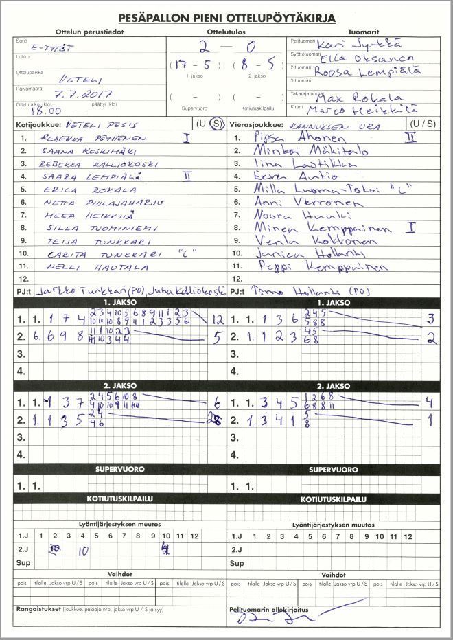 | 5.8.2017 | Veteli | Kajaani | 2-0 (17-6, 12-7) | näytä | |