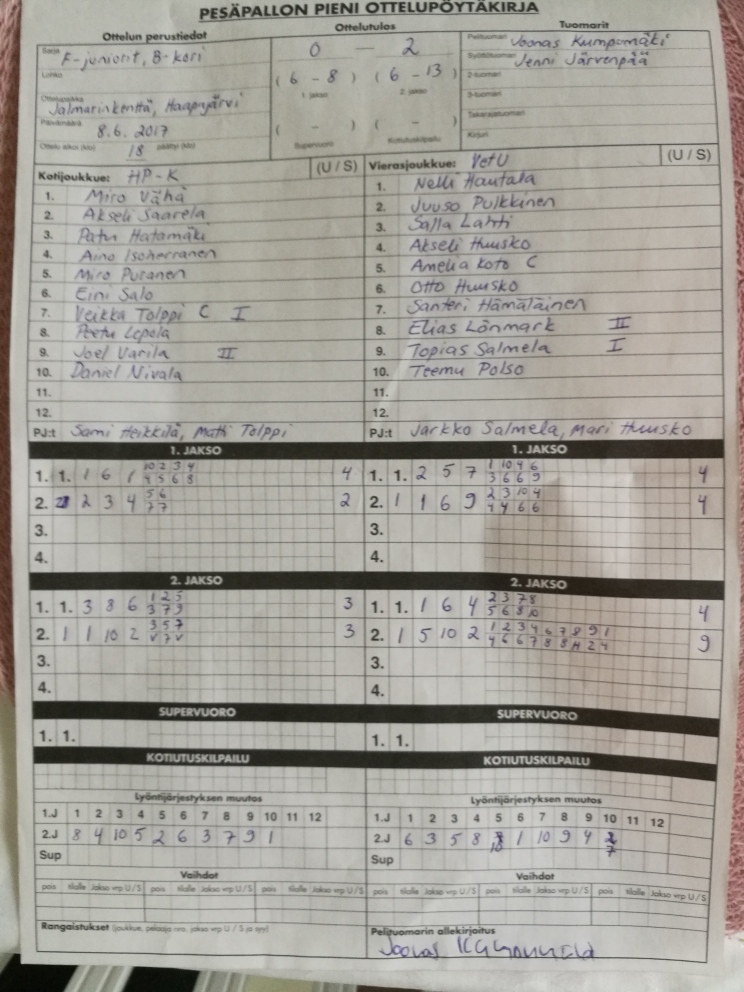 | 8.6.2017 | Haapajärvi 1 | Veteli | 0-2 (6-8, 6-13) | näytä | |