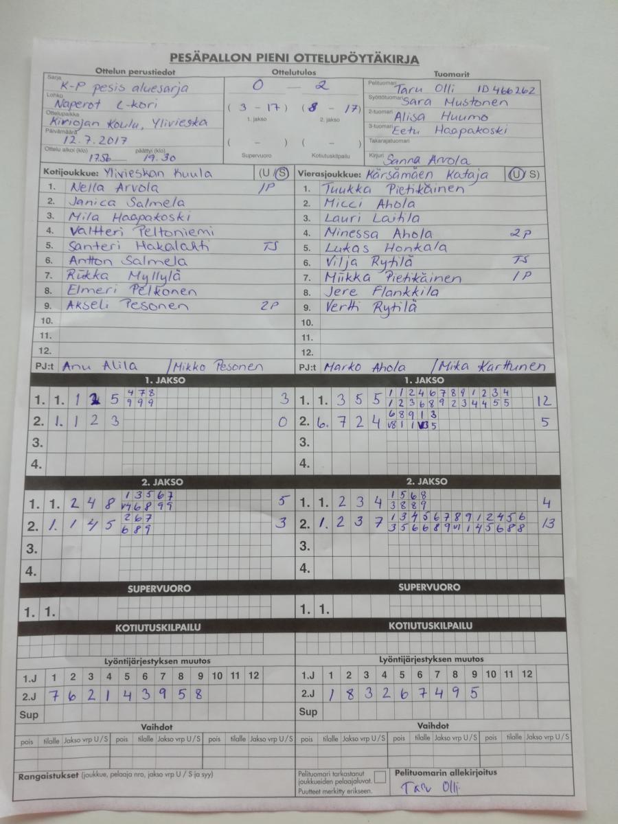 | 12.7.2017 | Ylivieska | Kärsämäki | 0-2 (3-17, 8-17) | näytä | |