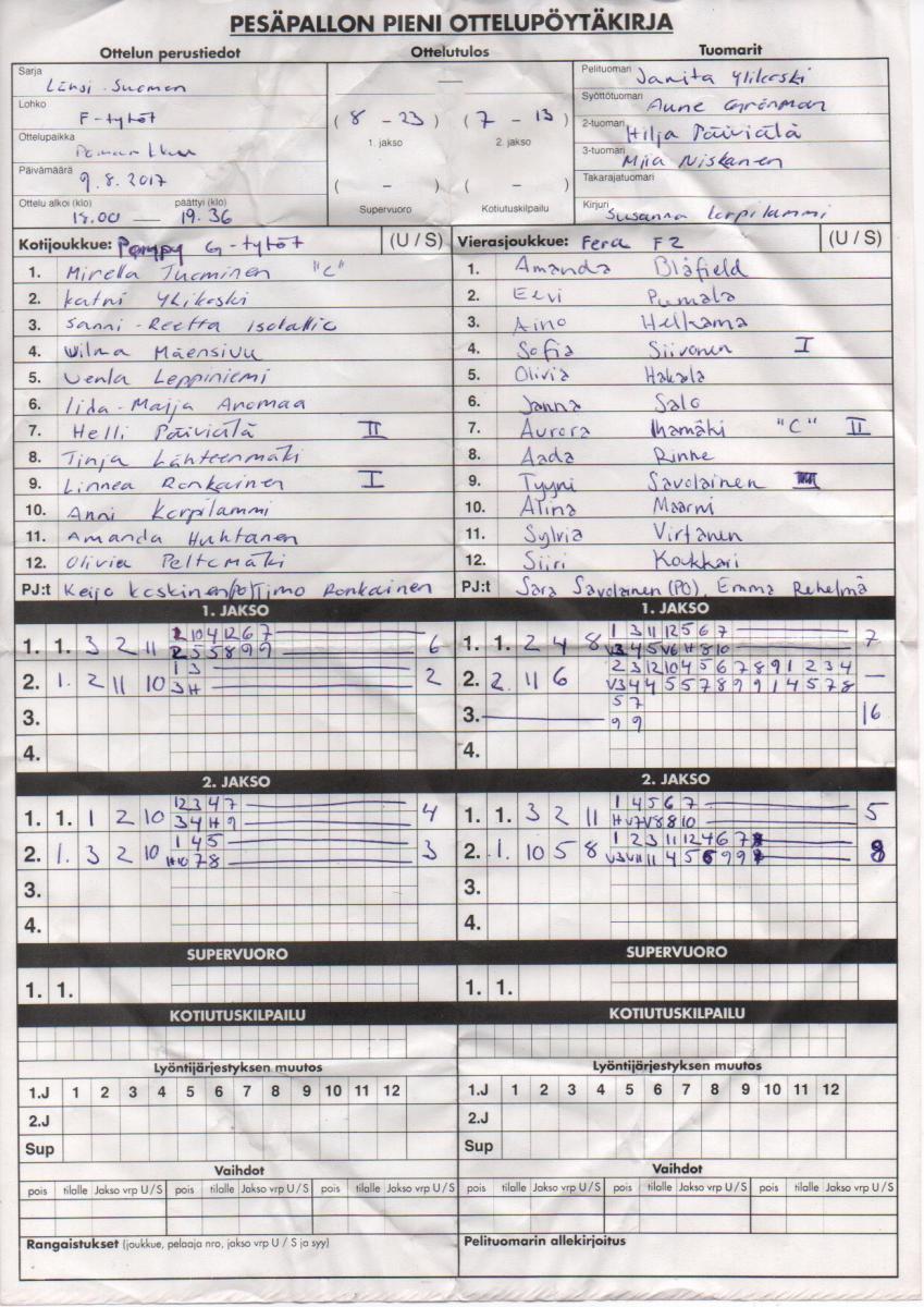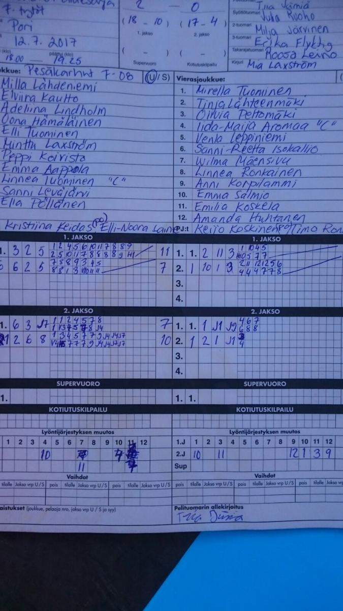 | 12.7.2017 18:00 | Pesäkarhut F-08 | PomPy G-tytöt | 2-0 (18-10, 17-4) | näytä | |