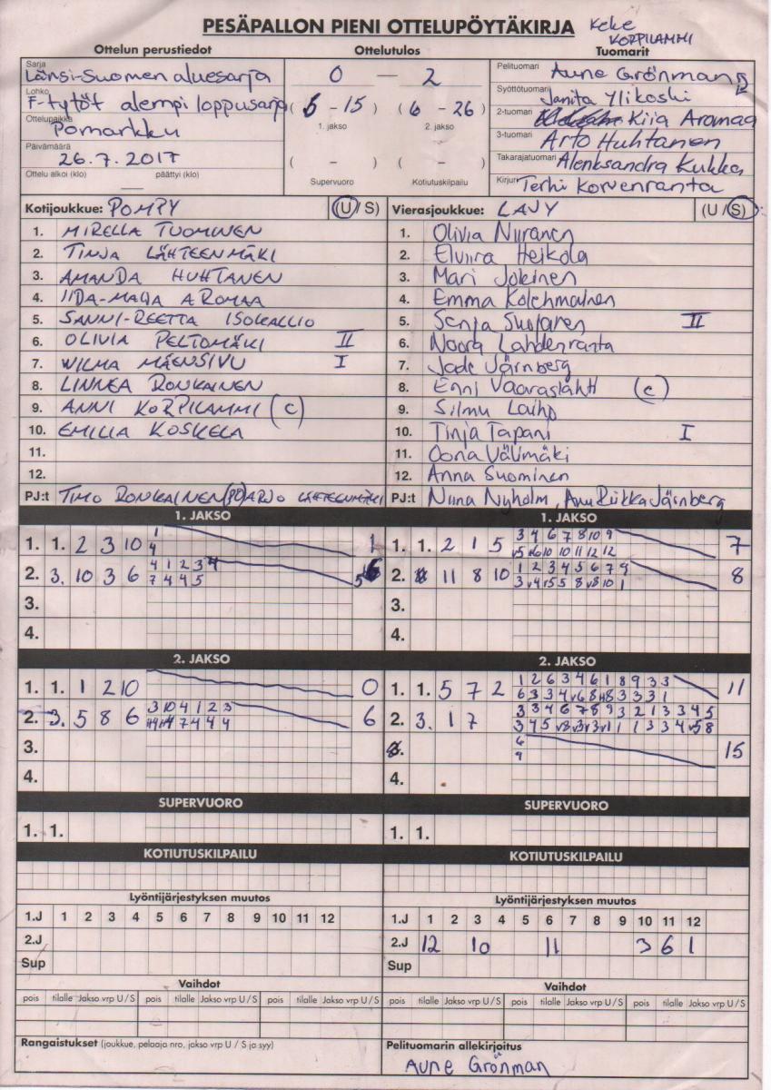 | 26.7.2017 18:00 | PomPy G-tytöt | LaJy F-tytöt | 0-2 (6-15, 6-26) | näytä | |