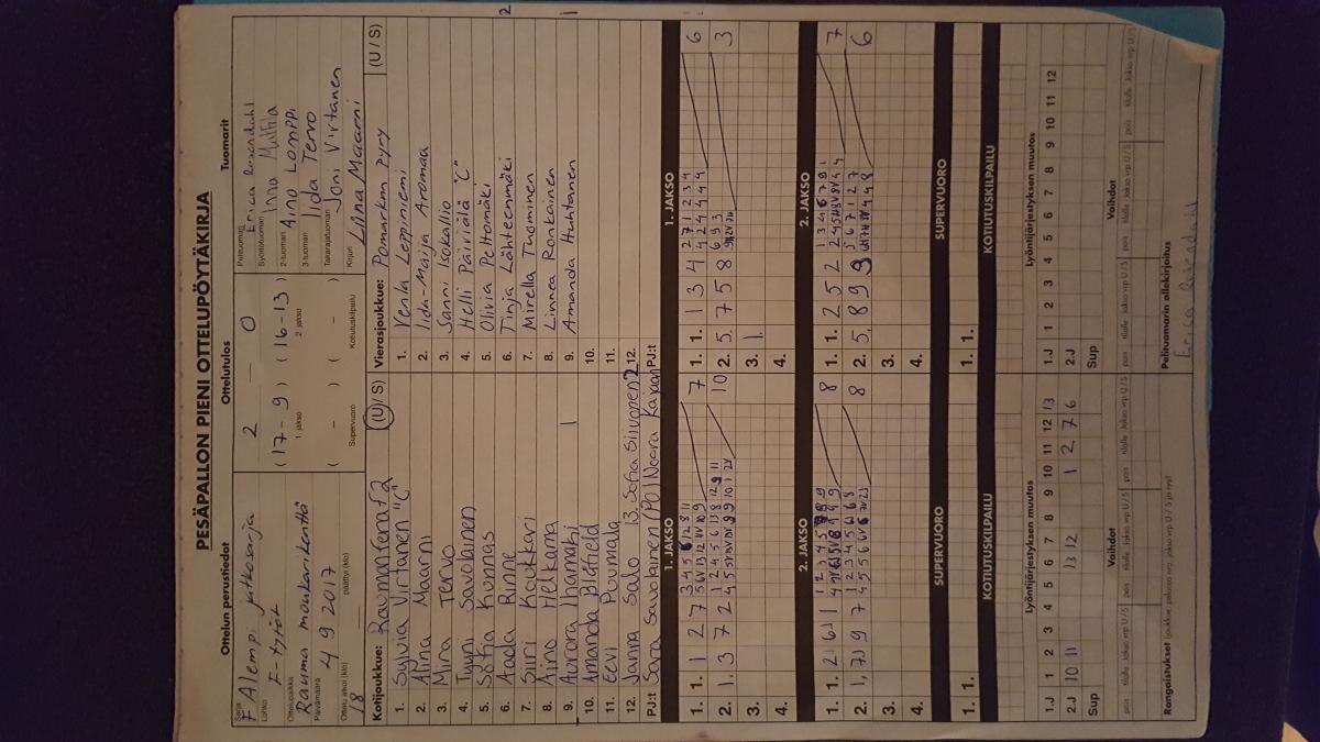 | 4.9.2017 18:00 | Fera F2 | PomPy G-tytöt | 2-0 (17-9, 16-13) | näytä |