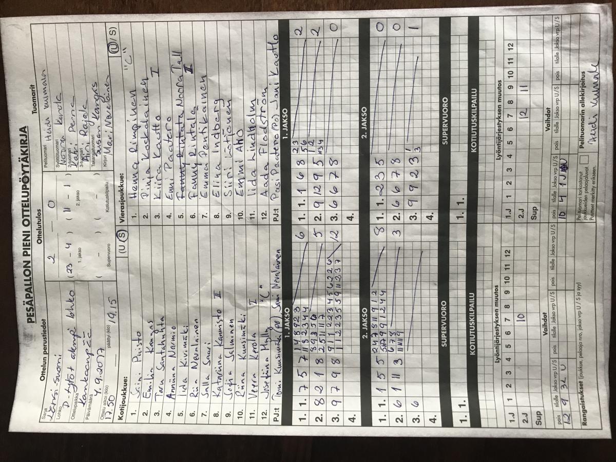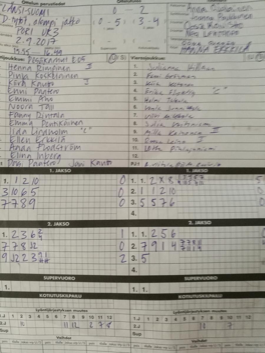 | 4.9.2017 18:00 | MJ-D tytöt | Pesäkarhut E05 | 2-0 (23-4, 11-1) | näytä | |