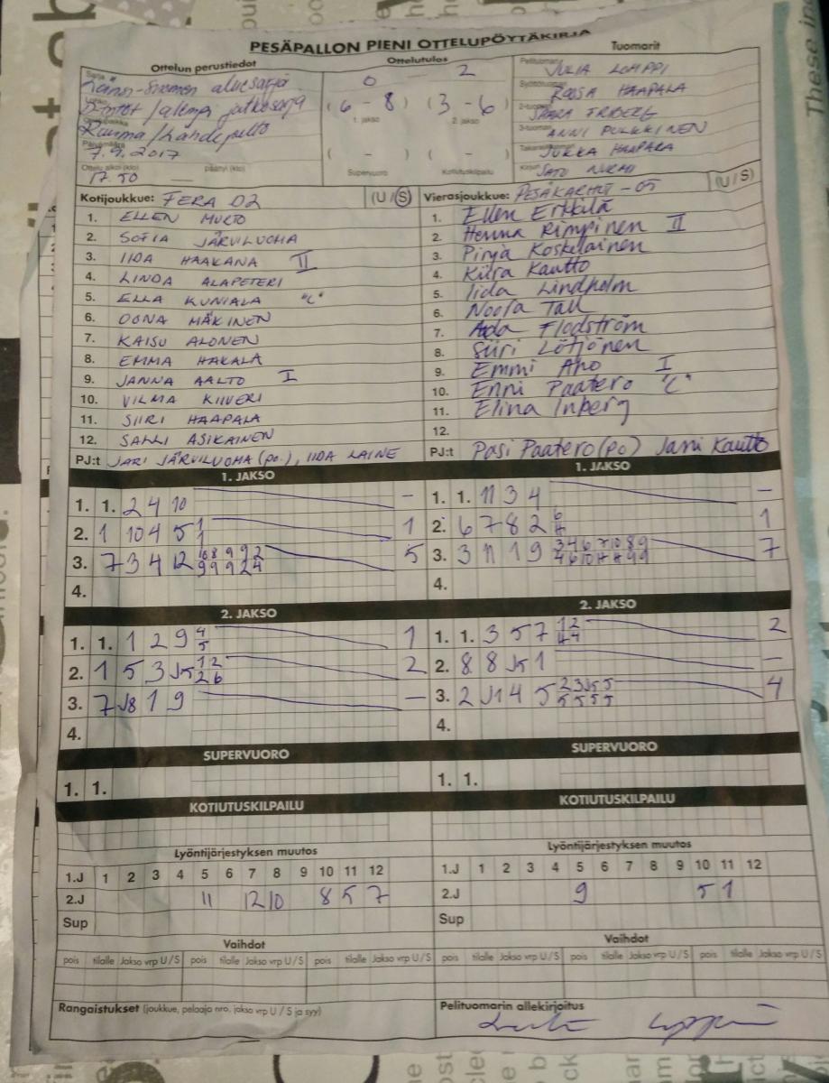 | 17.8.2017 18:00 | Pesäkarhut E05 | PomPy Et | 2-0 (20-6, 5-4) | näytä | |