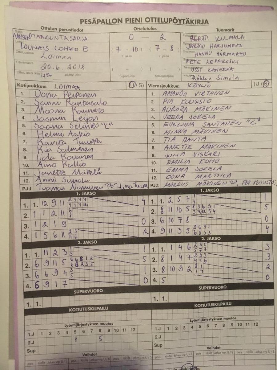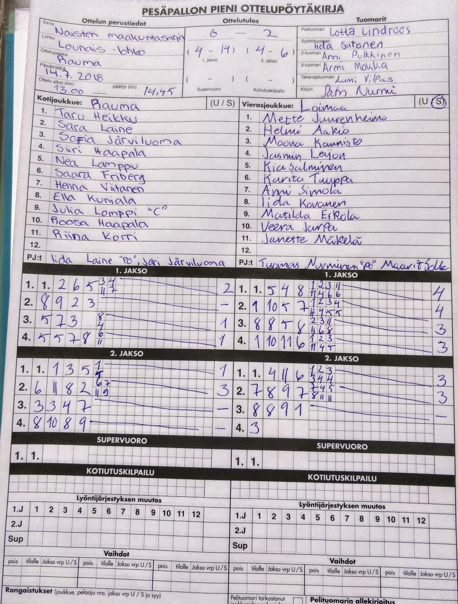 | 14.7.2018 | Rauman Fera | Loimaan Palloilijat | 0-2 (4-14, 4-6) | näytä | |