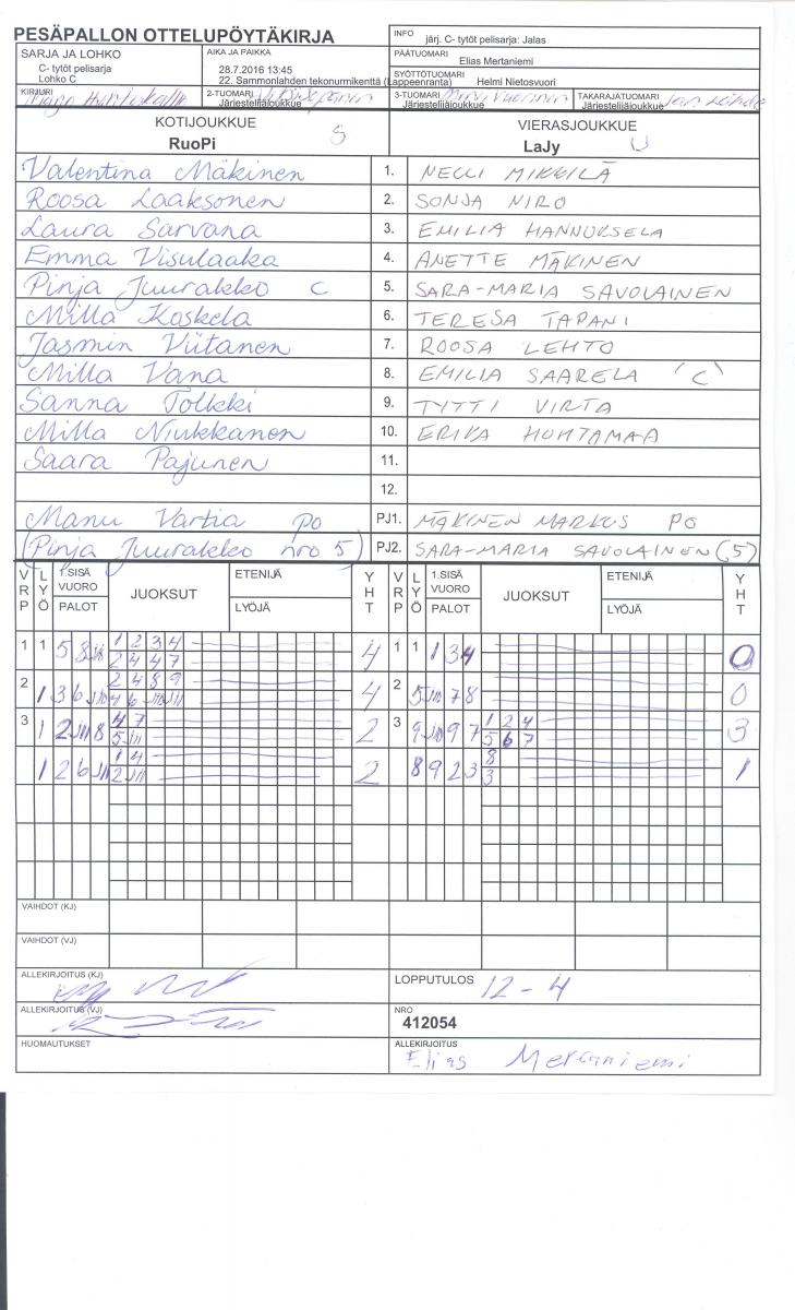| 28.7.2016 13:45 | C- tytöt pelisarja | Lohko C | RuoPi | LaJy | 12-4 | Jalas | näytä |