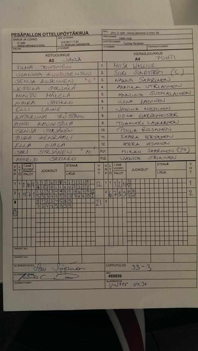 | 10.6.2017 17:30 | D- tytöt | Alempi jatkosarja D-lohko | Jana DT | Puhti | 33-3 | KöLa | näytä |