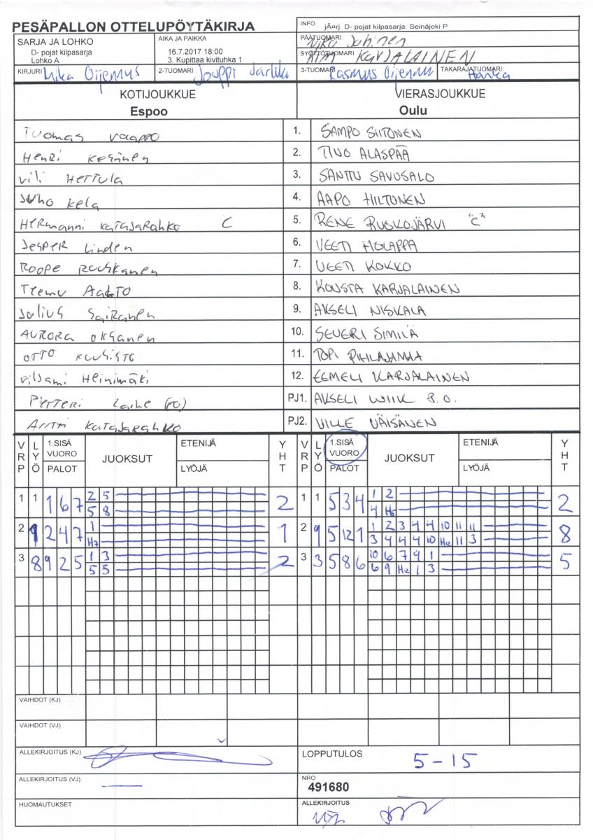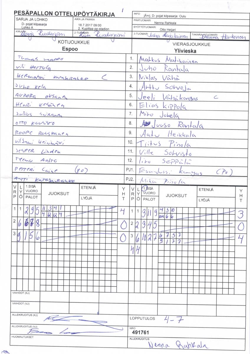 | 5. | Espoo | 9 | 4 | 1 | 4 | 63 - 70 | 9 |