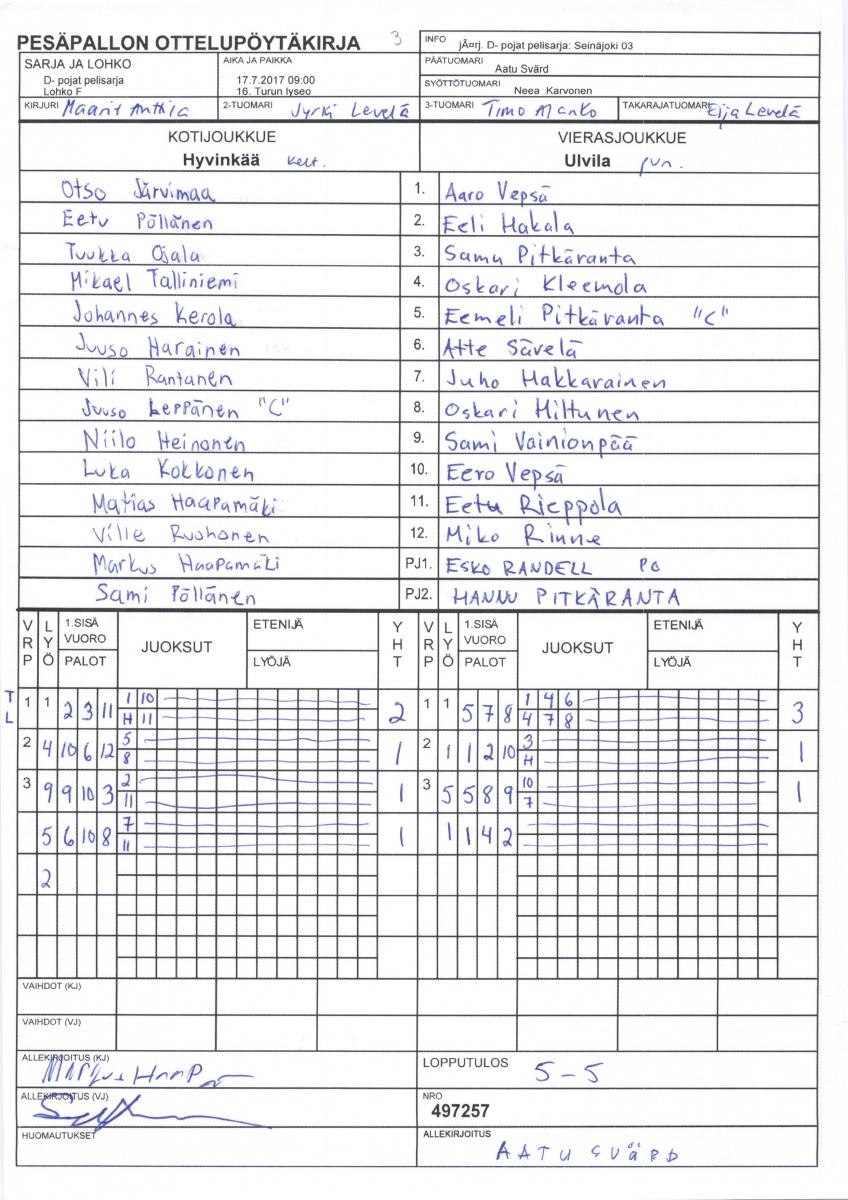 | 3. | Ulvila | 3 | 1 | 1 | 1 | 31 - 11 | 3 |