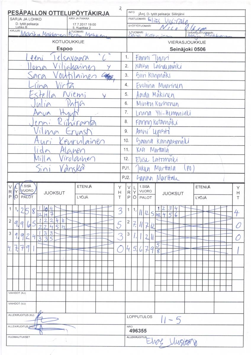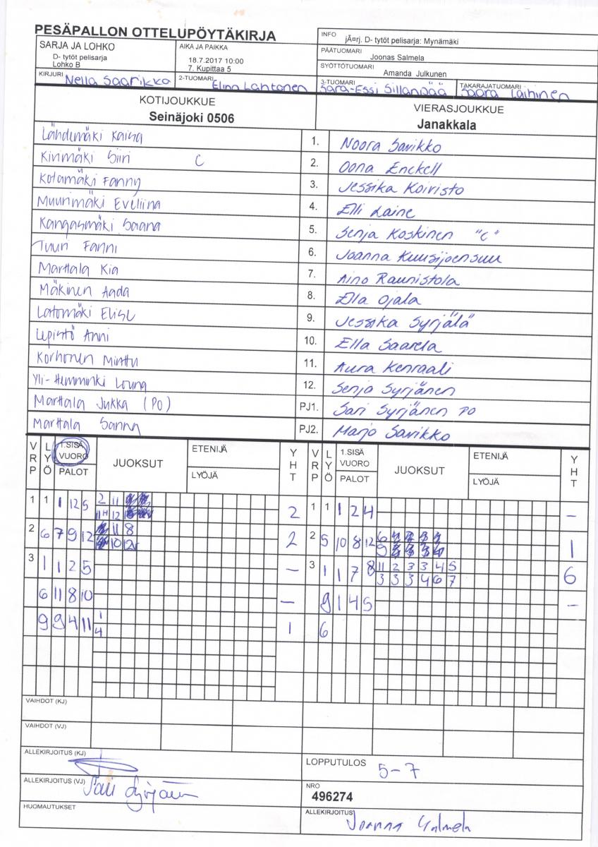 | 7. | Seinäjoki 0506 | 6 | 1 | 0 | 5 | 30 - 97 | 2 |