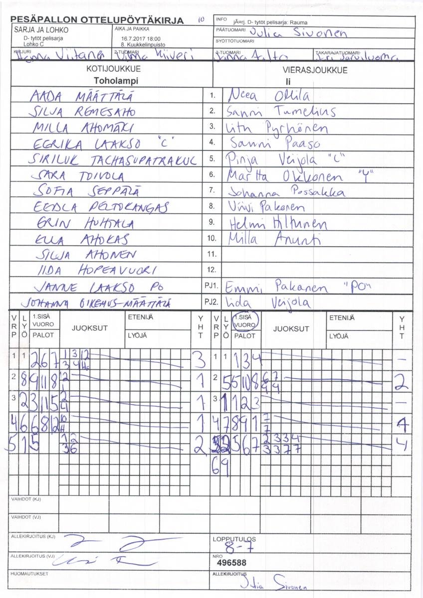 | 5. | Toholampi | 6 | 3 | 0 | 3 | 53 - 51 | 6 |