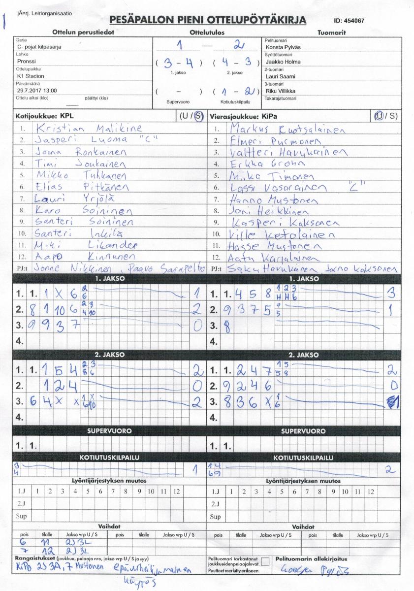 | 454067 | 29.7.2017 13:00 | K1 Stadion | KPL | KiPa | 1-2 (3-4, 4-3, 1-2) | Leiriorganisaatio | näytä |
