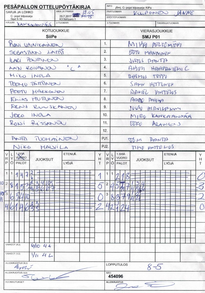 | 454096 | 29.7.2017 11:15 | K3 Niittyaro 1 | SiiPe | SMJ P01 | 8-5 | C- pojat kilpasarja: KiPa | näytä |