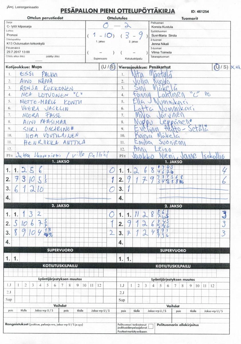 | 461254 | 29.7.2017 13:00 | K13 Oulunsalon kirkonkylä | Mups | Pesäkarhut | 0-2 (1-10, 3-9) | Leiriorganisaatio | näytä |