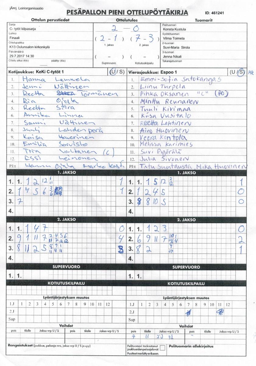 | 461241 | 29.7.2017 14:30 | K13 Oulunsalon kirkonkylä | KeKi C-tytöt 1 | Espoo 1 | 2-0 (2-1, 7-3) | Leiriorganisaatio | näytä |