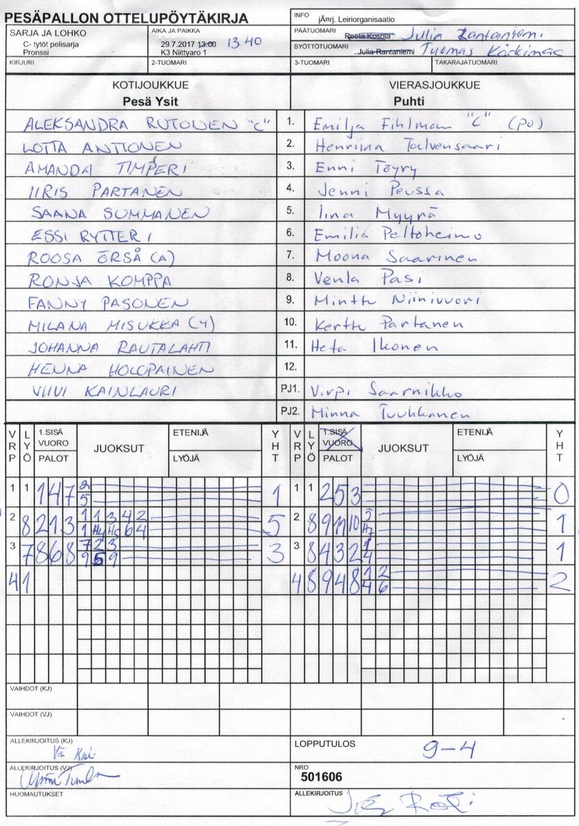 | 501606 | 29.7.2017 13:00 | K3 Niittyaro 1 | Pesä Ysit | Puhti | 9-4 | Leiriorganisaatio | näytä |