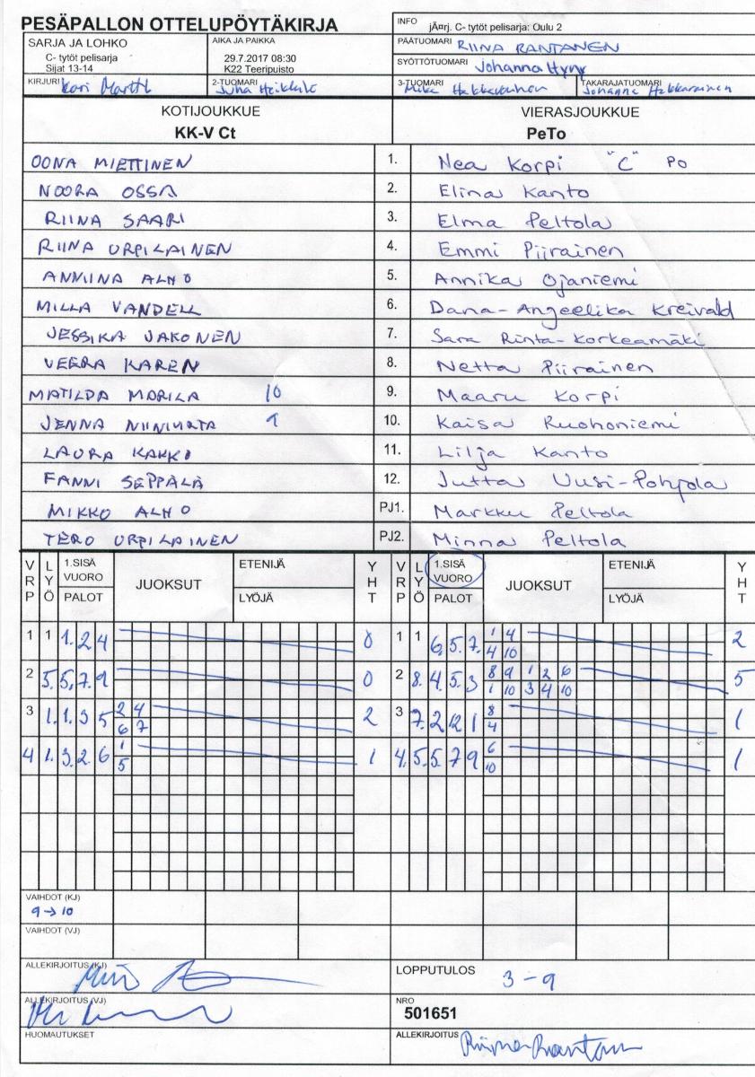 | 501651 | 29.7.2017 08:30 | K22 Teeripuisto | KK-V Ct | PeTo | 3-9 | C- tytöt pelisarja: Oulu 2 | näytä |