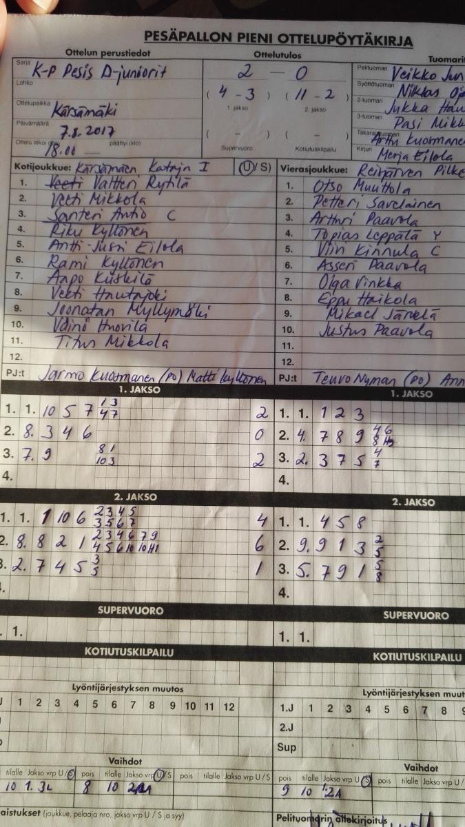 | 462389 | 2.6.2017 | Pyhäjärvi | Kärsämäki 1 | 0-2 (0-15, 3-14) | näytä |