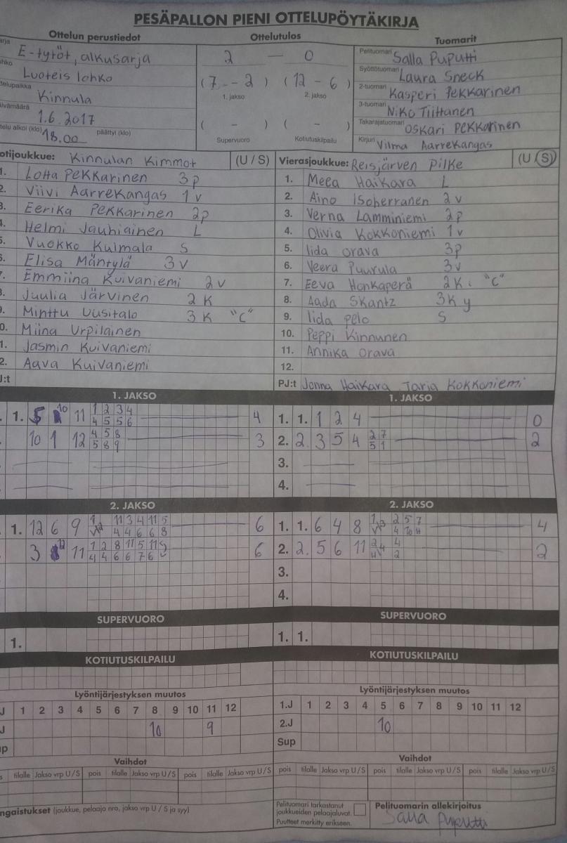 | 464170 | 1.6.2017 | Kinnula | Reisjärvi | 2-0 (7-2, 12-6) | näytä |