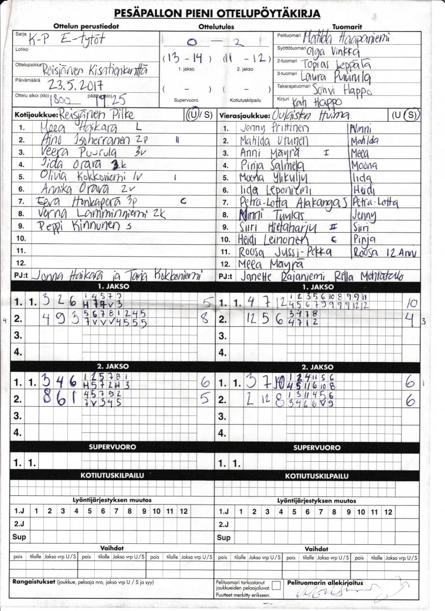 | 464510 | 23.5.2017 | Reisjärvi | Oulainen | 0-2 (13-14, 11-12) | näytä |