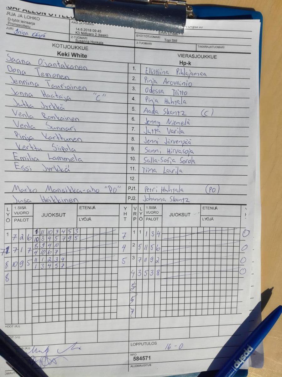 | 584571 | 14.6.2018 09:45 | K3 Niittyaro 2 (keski) | Keki White | Hp-k | 16-0 | D-tytöt leirisarja: SiKi D-tytöt 05 | näytä |