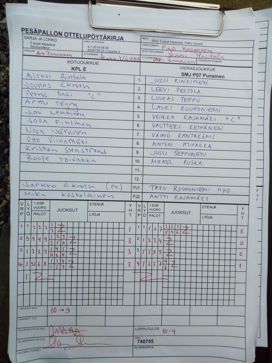 | 740755 | 6.7.2019 09:30 | KENTTÄ 01 | Cuuma A | KPL E | SMJ P07 Punainen | 10-4 | E-pojat kilpasarja: PattU Juniorit | näytä |