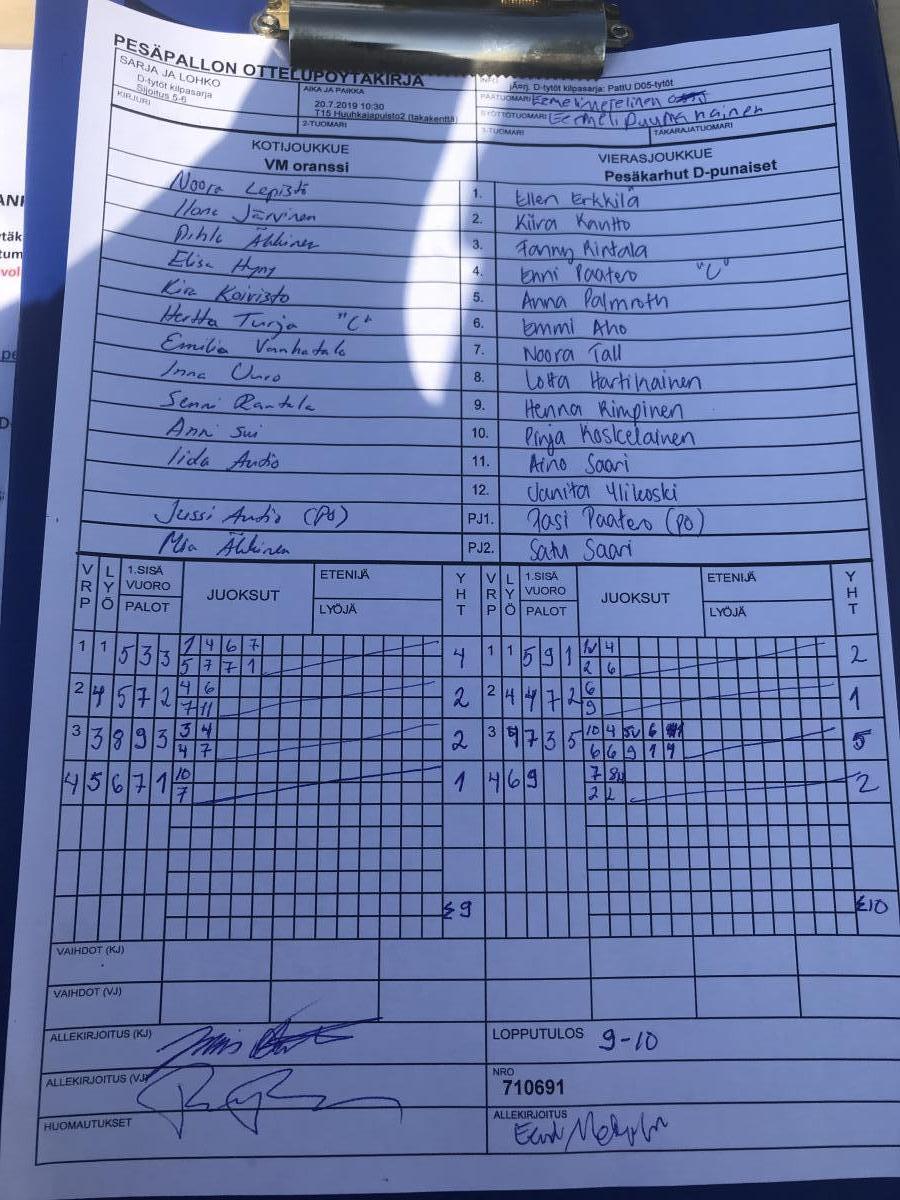 | 710691 | 20.7.2019 10:30 | T15 Huuhkajapuisto2 (takakenttä) | VM oranssi | Pesäkarhut D-punaiset | 9-10 | D-tytöt kilpasarja: PattU D05-tytöt | näytä |