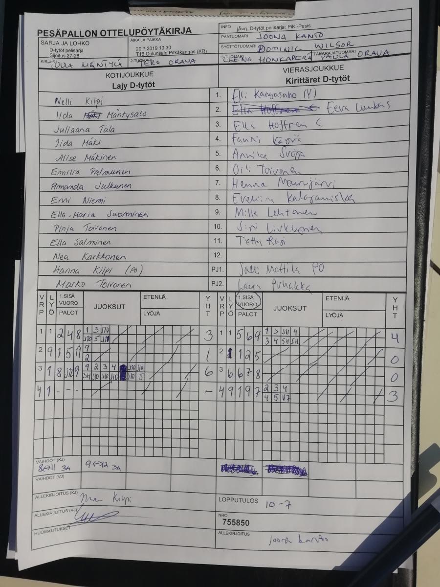 | 755850 | 20.7.2019 10:30 | T16 Oulunsalo Pitkäkangas (KR) | Lajy D-tytöt | Kirittäret D-tytöt | 10-7 | D-tytöt pelisarja: PiKi-Pesis | näytä |