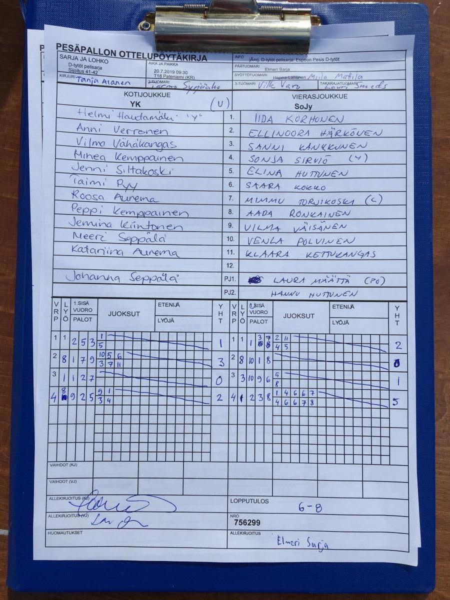 | 756299 | 20.7.2019 09:30 | T18 Pateniemi (KR) | YK | SoJy | 6-8 | D-tytöt pelisarja: Espoon Pesis D-tytöt | näytä |