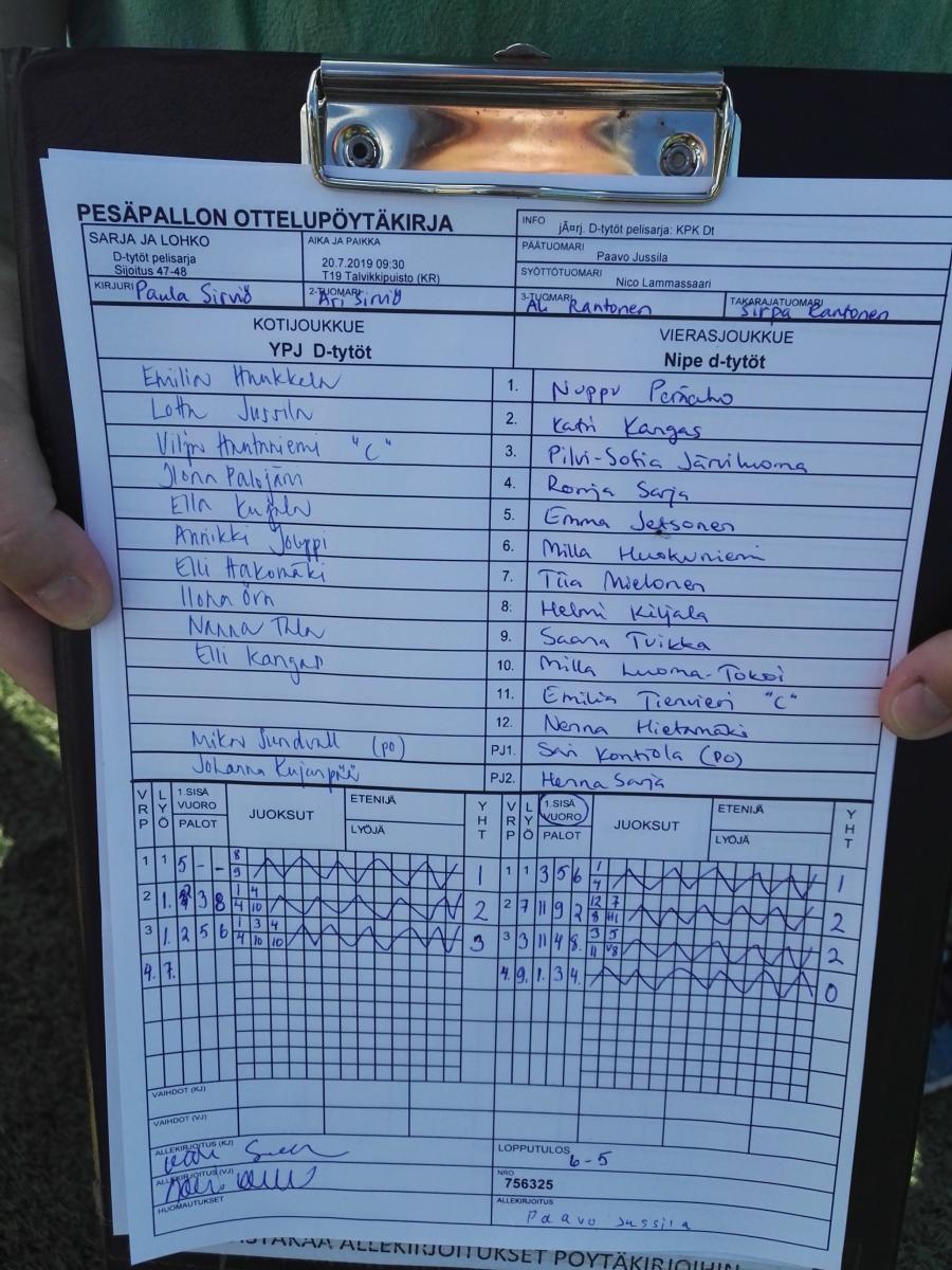 | 756325 | 20.7.2019 09:30 | T19 Talvikkipuisto (KR) | YPJ D-tytöt | Nipe d-tytöt | 6-5 | D-tytöt pelisarja: KPK Dt | näytä |