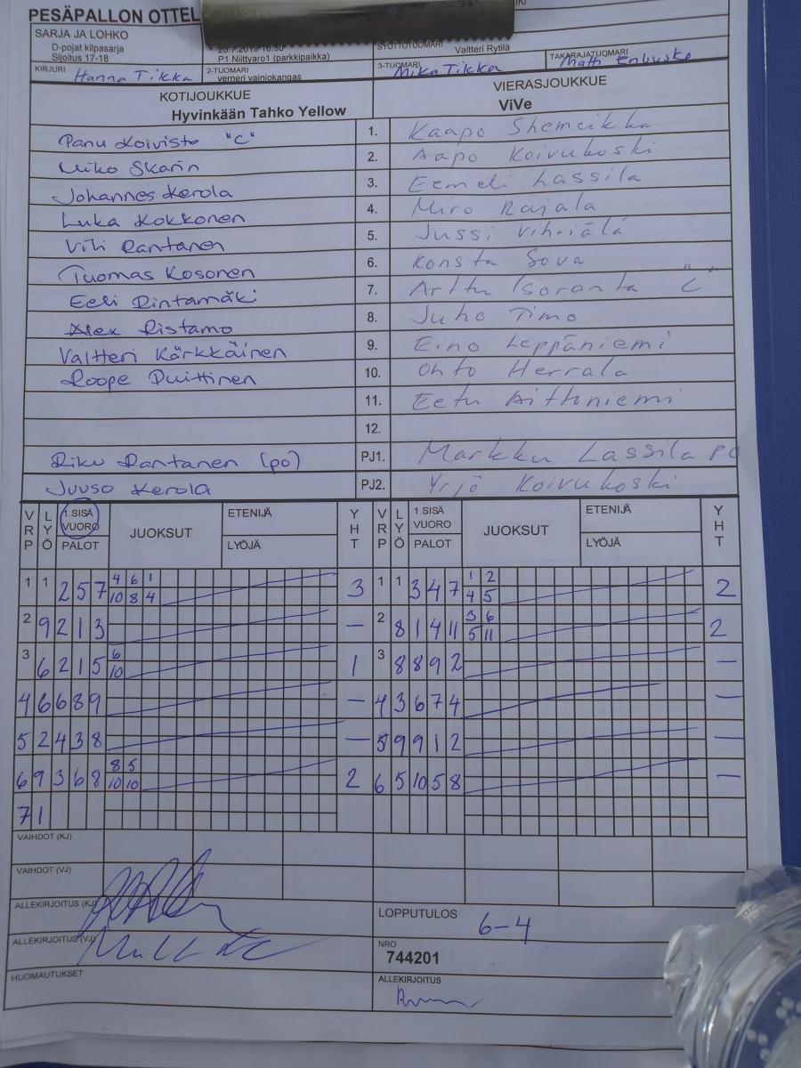 | 744201 | 20.7.2019 10:30 | P1 Niittyaro1 (parkkipaikka) | Hyvinkään Tahko Yellow | ViVe | 6-4 | D-pojat kilpasarja: SiKi | näytä |