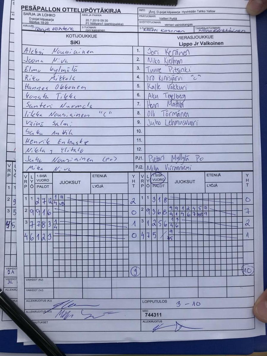 | 744311 | 20.7.2019 09:30 | P1 Niittyaro1 (parkkipaikka) | SiKi | Lippo Jr Valkoinen | 3-10 | D-pojat kilpasarja: Hyvinkään Tahko Yellow | näytä |