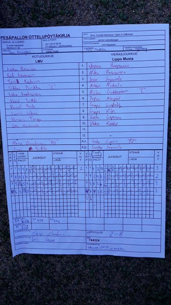 | 744324 | 20.7.2019 08:30 | P1 Niittyaro1 (parkkipaikka) | LMV | Lippo Musta | 2-8 | D-pojat kilpasarja: Lippo Jr Valkoinen | näytä |