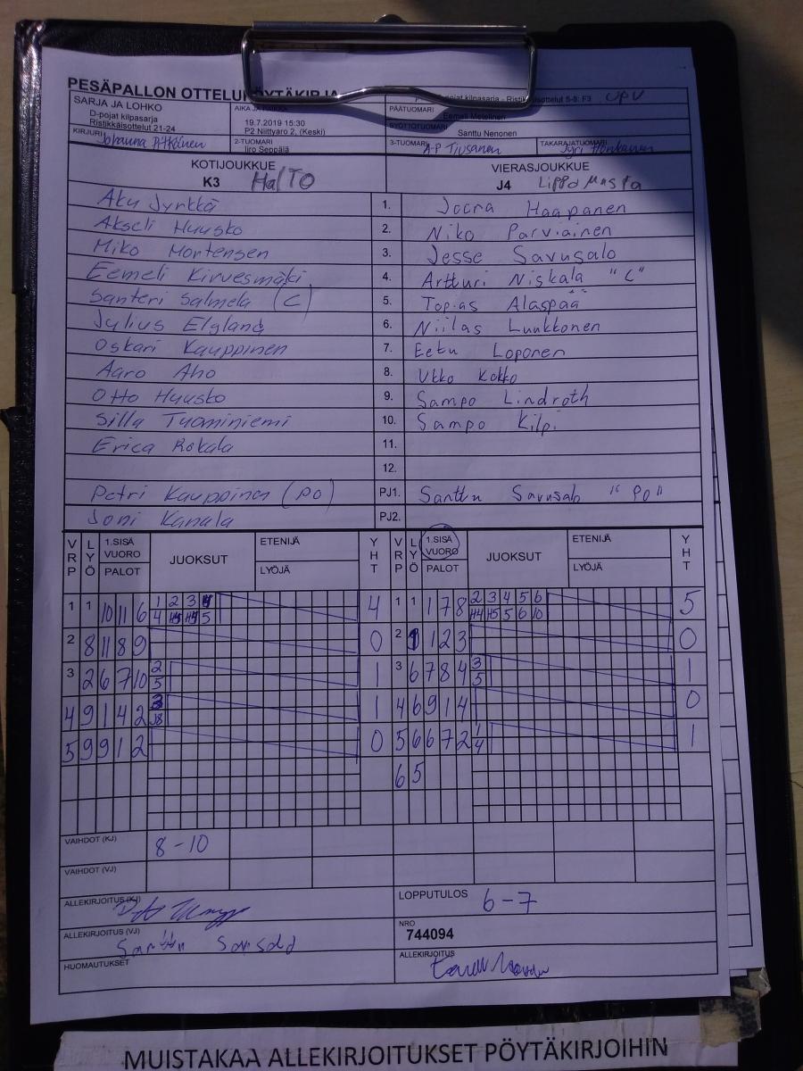 | 744094 | 19.7.2019 15:30 | P2 Niittyaro 2, (Keski) | HalTo | Lippo Musta | 6-7 | D-pojat kilpasarja: KPL Yellow | näytä |