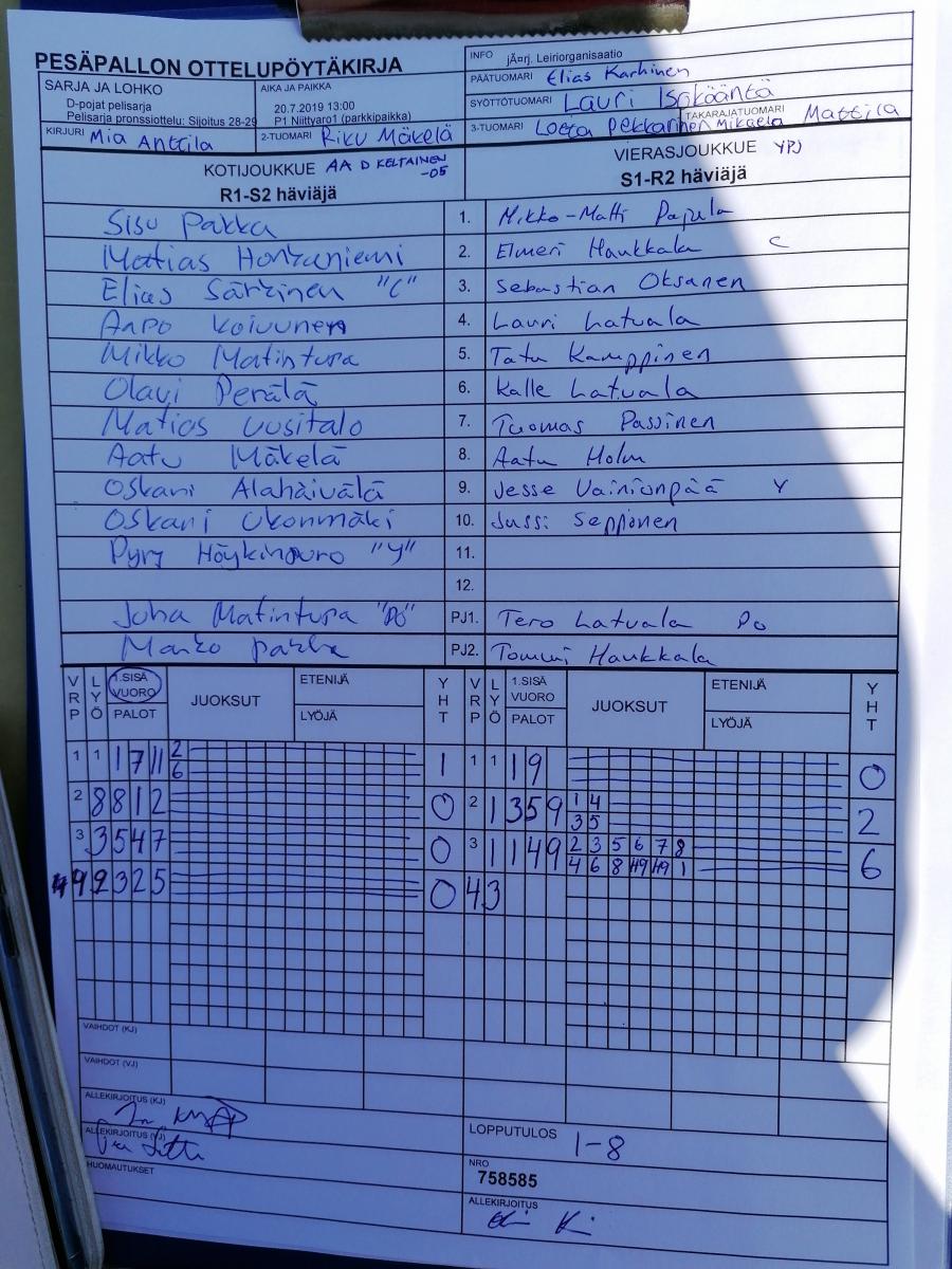 | 758585 | 20.7.2019 13:00 | P1 Niittyaro1 (parkkipaikka) | AA D keltainen -05 | YPJ | 1-8 | Leiriorganisaatio | näytä |