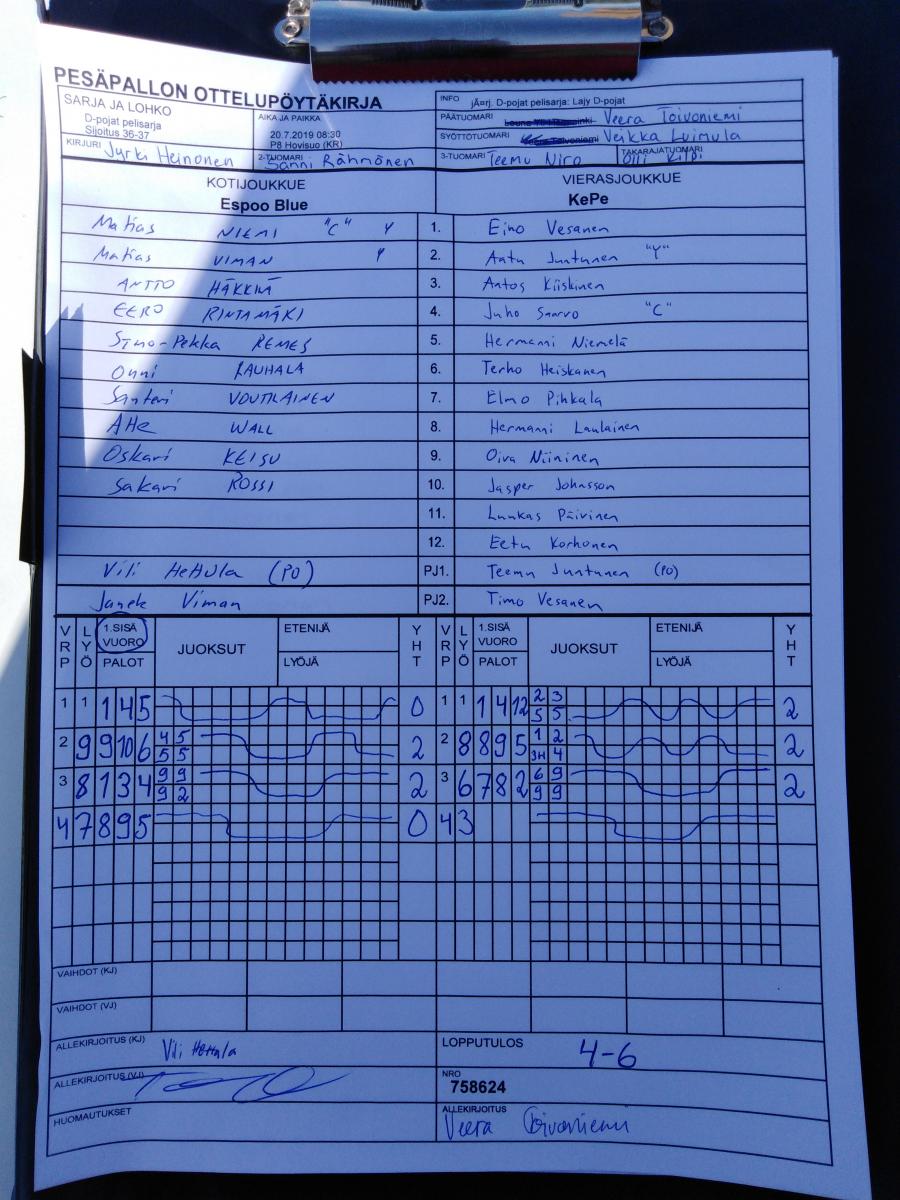 | 758624 | 20.7.2019 08:30 | P8 Hovisuo (KR) | Espoo Blue | KePe | 4-6 | D-pojat pelisarja: Lajy D-pojat | näytä |